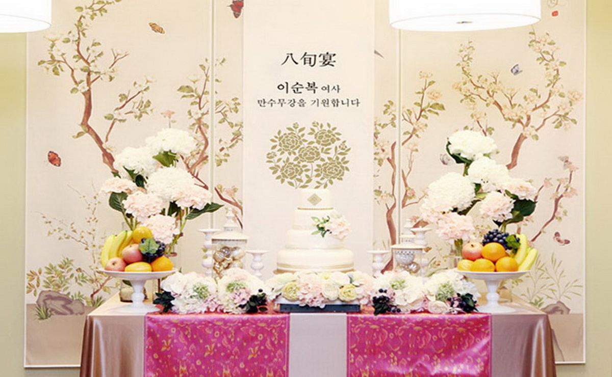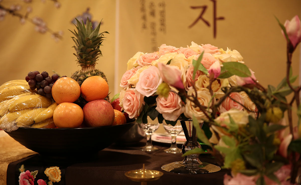 | 상차림 | 모조 : 고임상 실물 : 떡 5가지, 과일 5가지, 고임상 |